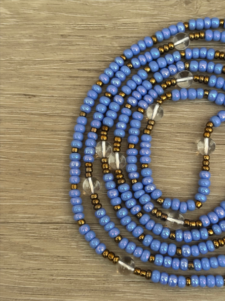 This serene strand of waist beads features soft lblue and gold beads accented with Clear Quartz. Light blue represents calm, peace, and gentle communication, while gold symbolizes divine energy and illumination. Clear Quartz, known as the master healing crystal, amplifies clarity, intention, and spiritual alignment.