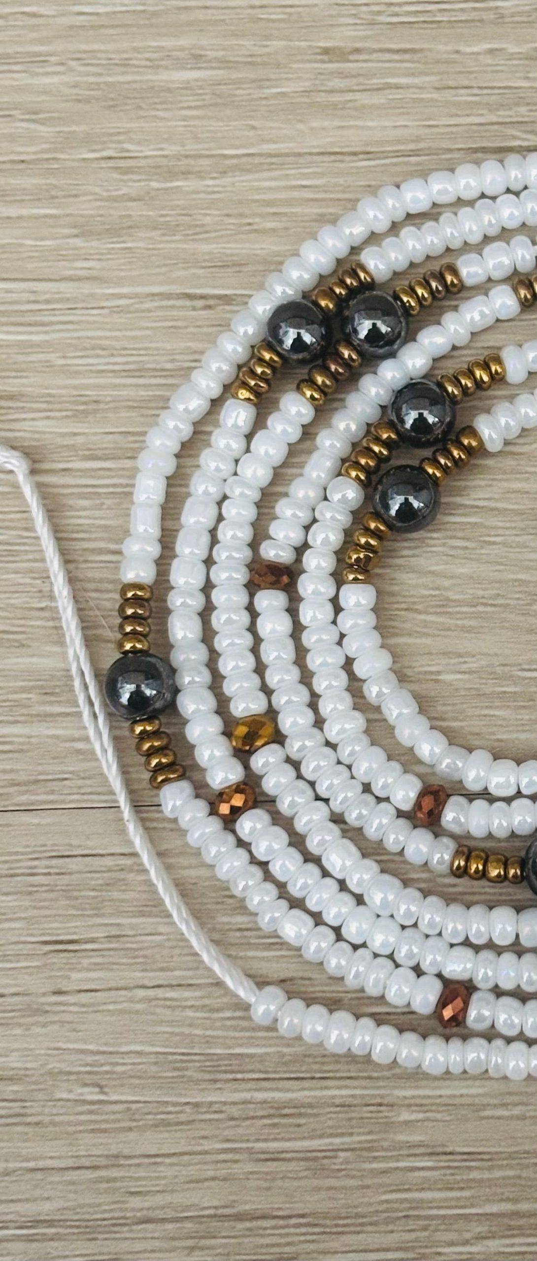 This elegant strand of waist beads features luminous white beads accented with Hematite. White symbolizes purity, clarity, and new beginnings, while Hematite is known for its grounding and protective energy.
