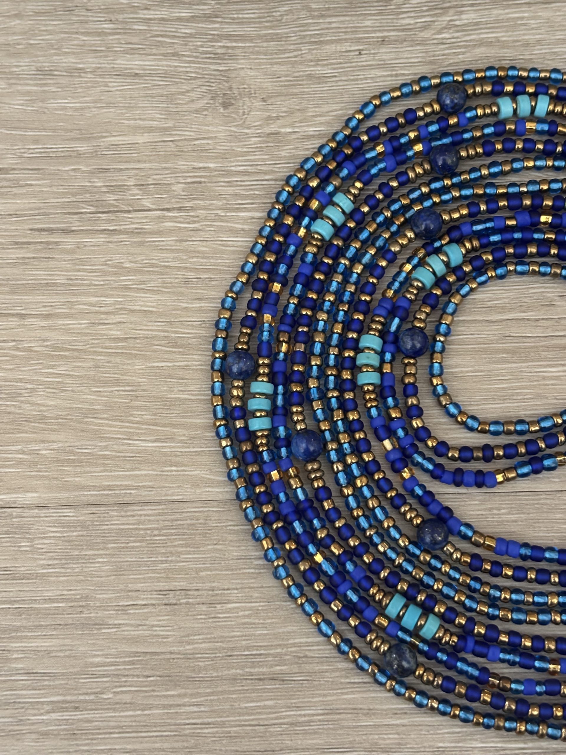 This set of three waist beads features vibrant blue beads accented with Lapis Lazuli and Turquoise. Lapis Lazuli is known for enhancing wisdom, intuition, and self-expression, while Turquoise offers protection, balance, and healing energy.